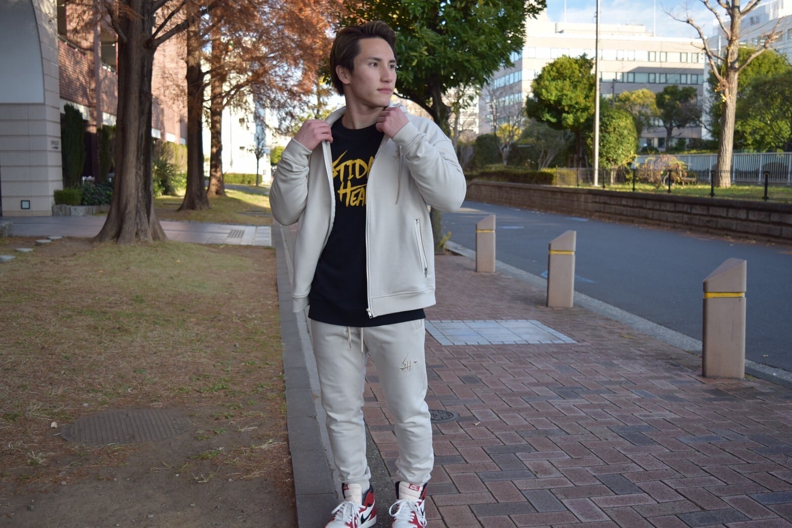 綿100%では表現することのできない見た目の光沢感と生地の柔らかさ、ストレッチ性抜群なルアナ裏毛を使用したセットアップ。